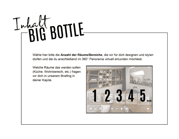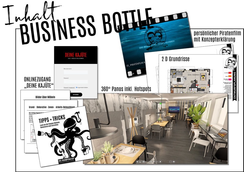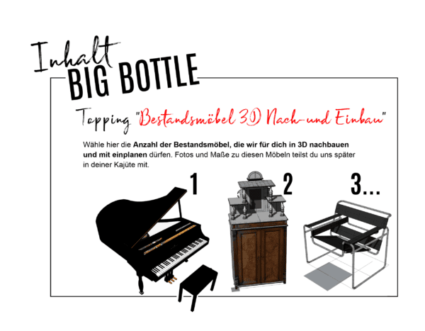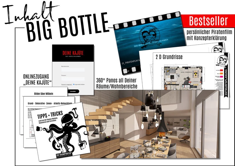 - Ganz gleich ob nur 2D Grundrissplanung (SMALL BOTTLE) oder eine ausführliche, fotorealistische 360°/3D-Planung mit Möbel-, Material- und Produktempfehlungen (BIG BOTTLE oder BUSINESS BOTTLE) ganz deiner Stilrichtung und deinem Budget entsprechend.