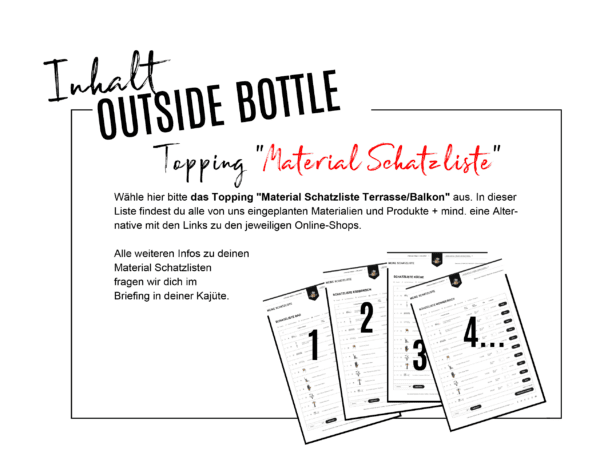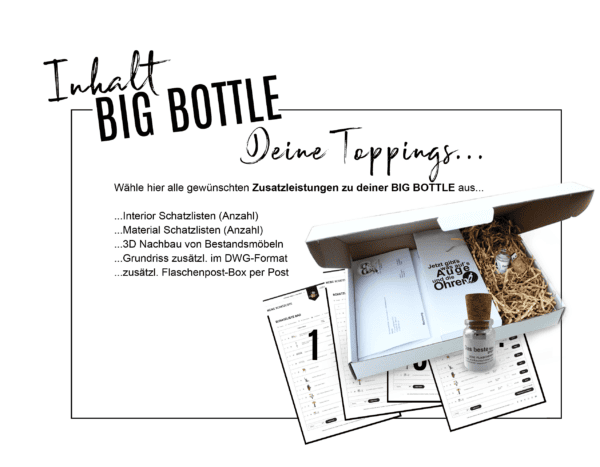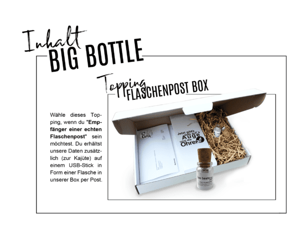 Auf Wunsch (TOPPING) macht sich anschließend zusätzlich unsere Flaschenpost- Box auf die Reise zu Dir.