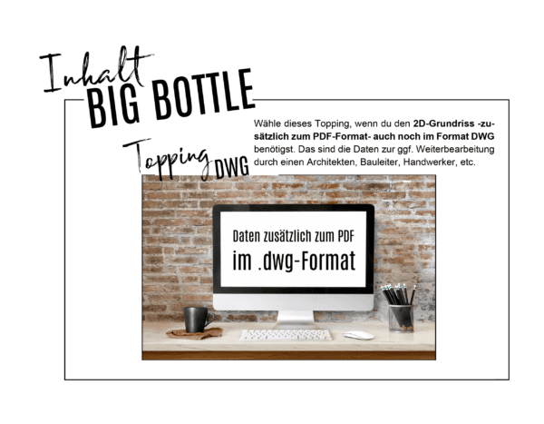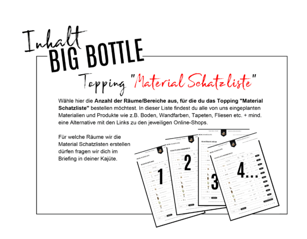 Wähle die für dein Projekt passende Planung/BOTTLE aus und konfiguriere sie direkt auf der Produktseite unter „FILL ME!“ ganz nach deinen Wünschen und Anforderungen (die Preise werden dir dort direkt angezeigt). Mögliche TOPPINGS sind z.B. unsere Material-, Produkt- und Möbelschatzlisten mit Links zu den jeweiligen Shops oder der Nachbau von Bestandsmöbeln u.v.m.