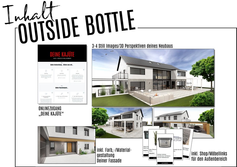 - Seit Juli 2023 haben wir sogar unsere BOTTLE-Angebote um die OUTSIDE BOTTLE (mit vielen Planungsleistungen rund um den Außenbereich) erweitert.