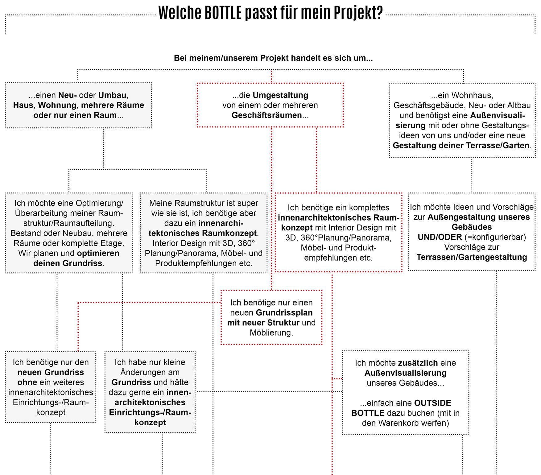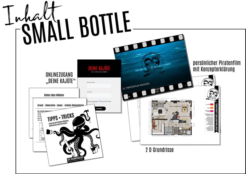 SMALL BOTTLE mit Grundrissplanung, Grundrissoptimierung, BIG BOTTLE zusätzlich mit 360° Raumplanung inkl. Design und Styling deiner Räume (und natürlich passenden Einkaufslisten der eingeplanten Produkte), OUTSIDE BOTTLE mit z.B. Fassadenstyling, Garten-, Terrassen- und Balkongestaltung u.v.m. für Business oder Privat.