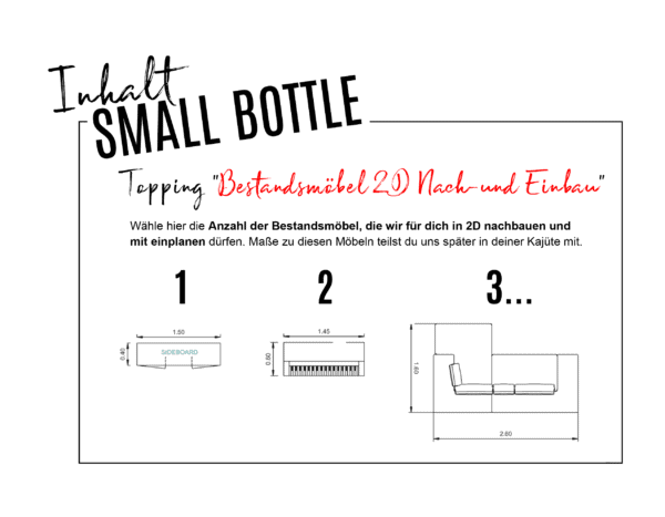 - Fotos (möglichst frontal) und Maße aller Bestandsmöbel, die ggf. in 3D nachgebaut werden sollen (TOPPING)